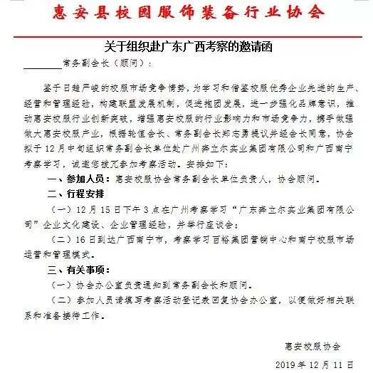 為學習和借鑒校服優(yōu)秀企業(yè)先進的生產(chǎn)、經(jīng)營和管理經(jīng)驗,構(gòu)建聯(lián)盟發(fā)展機制,促進企業(yè)抱團發(fā)展,進一步強化品牌意識,推動惠安校服行業(yè)創(chuàng)新突破,增強惠安校服的行業(yè)影響力和市場競爭力,攜手做強做大惠安校服產(chǎn)業(yè),12月15~17日,惠安縣校園服飾裝備行業(yè)協(xié)會會員單位赴廣東、廣西進行考察交流活動?;顒悠陂g先后考察廣東奔立爾集團、廣東雅藝服飾、百裕集團