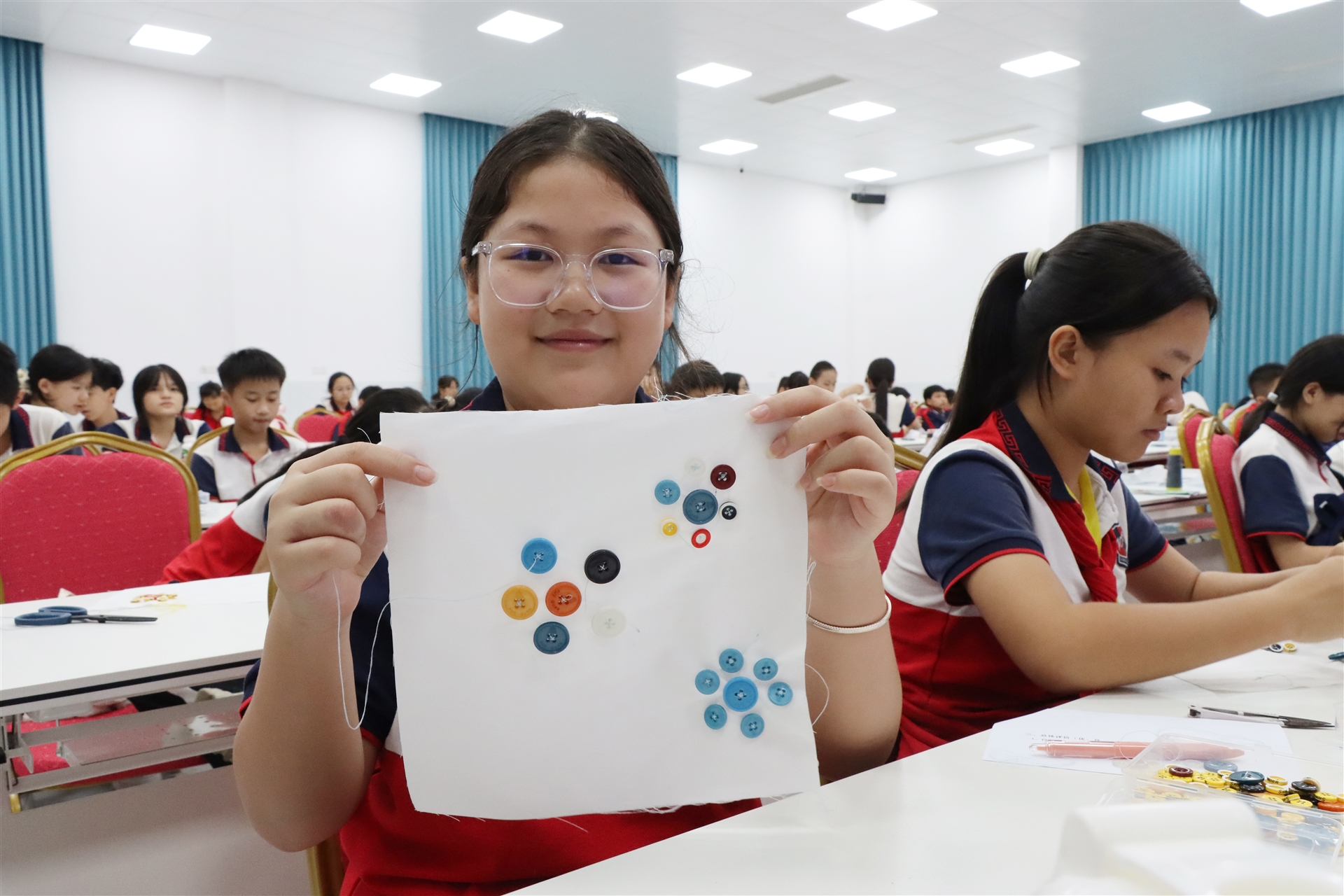 孩子們還體驗(yàn)了一場(chǎng)別開生面的服飾小制作,領(lǐng)略了制作之美。在老師的指導(dǎo)下,學(xué)生們首先了解紐扣的基本構(gòu)造和縫制紐扣的步驟要領(lǐng),之后再自己動(dòng)手做“針線活”,用略顯稚嫩的小手把扣子穿牢固定,還發(fā)揮了自己的想象力,把不同的扣子組合拼接,形成一幅幅生動(dòng)的花朵“畫作”。