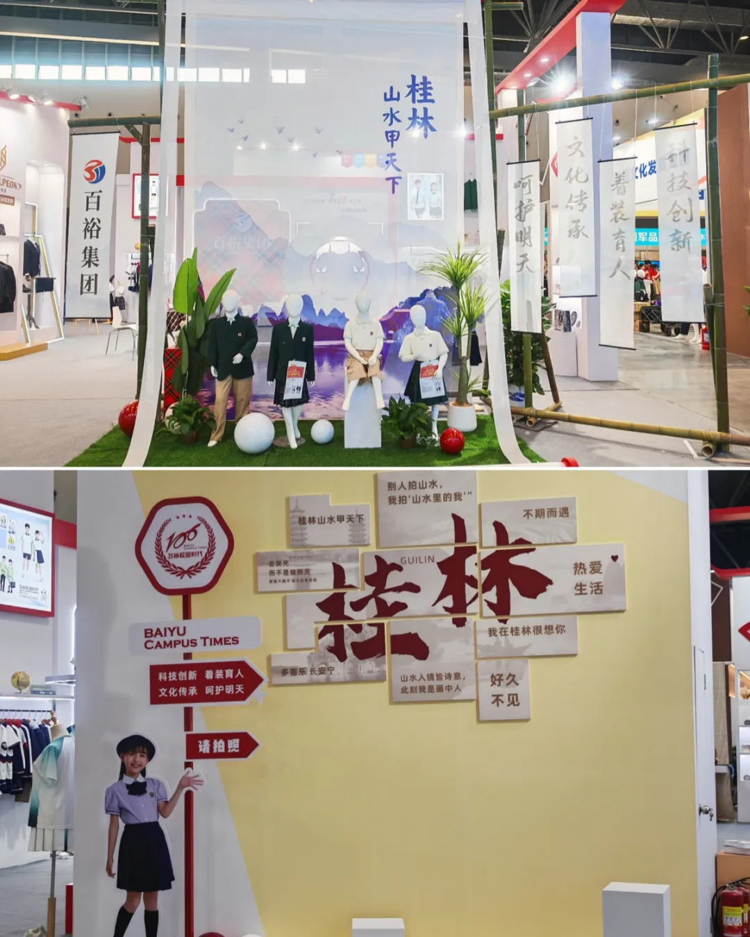 此次參展,百裕集團巧妙融合桂林地域文化特色,將“水墨丹青”系列校服產品置于沉浸式的桂林山水場景之中:一幅徐徐展開的靈動畫卷,將清新雅致的校服與詩意山水交相輝映,生動詮釋了校園服飾美學與地域文化傳承的完美結合,彰顯了百裕在校服設計領域的深厚功底與美學追求,展位還精心設計打卡區(qū),吸引了眾多參觀者駐足欣賞、拍照留念。