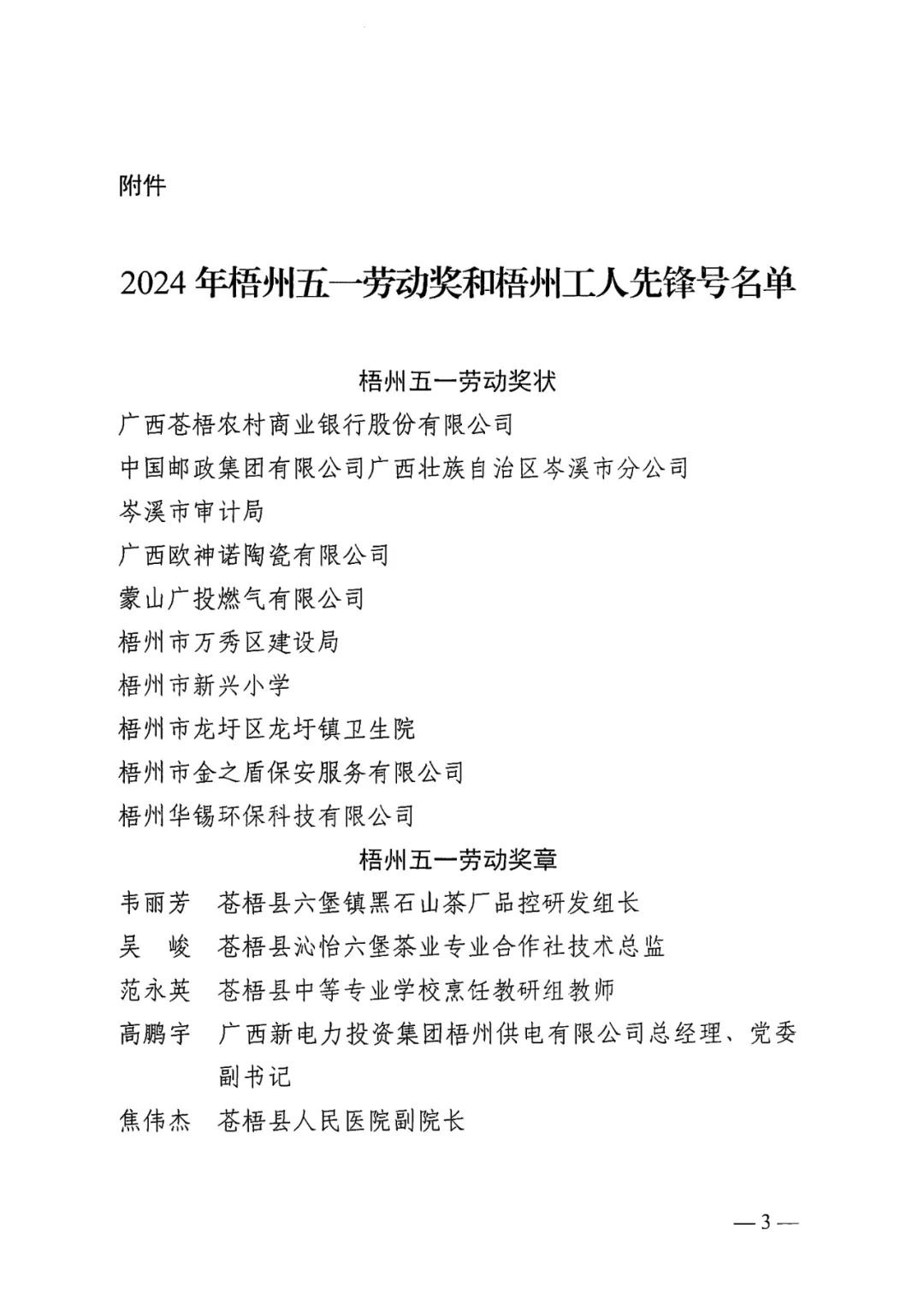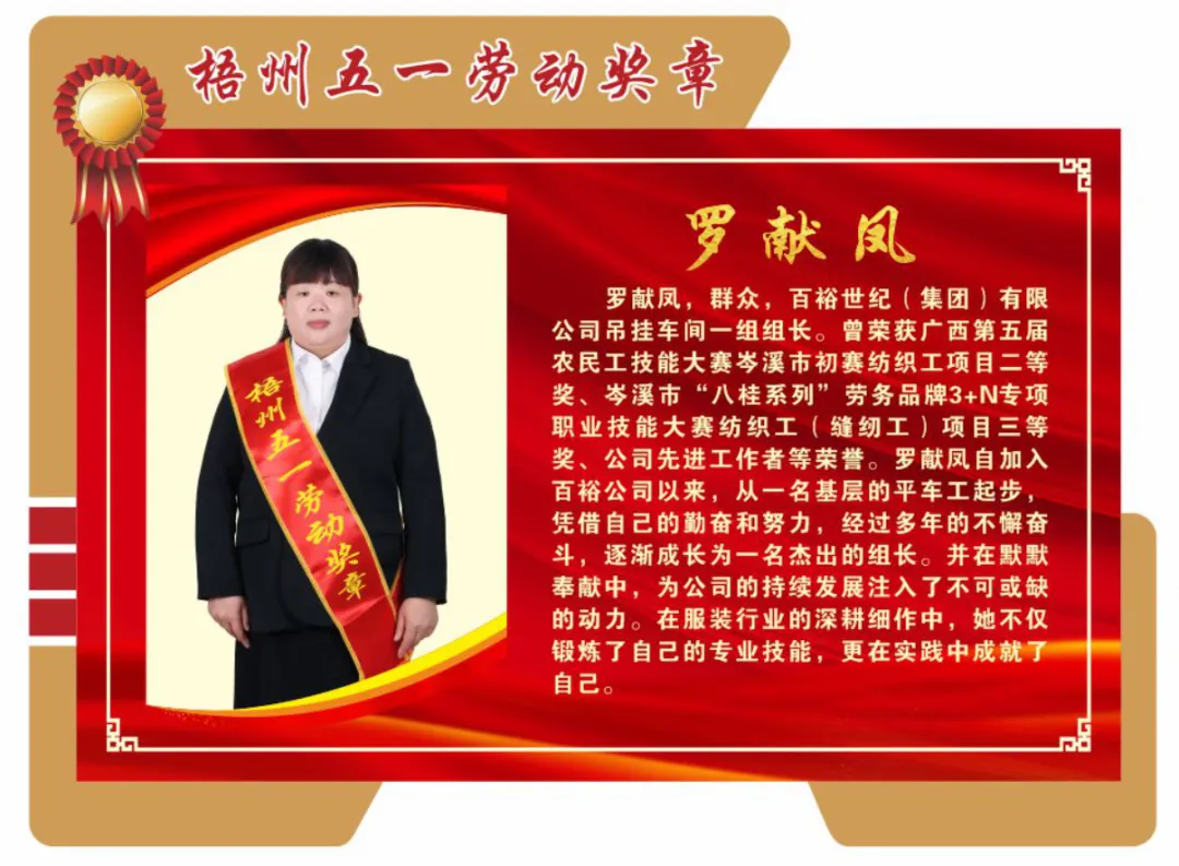 4月26日,梧州市總工會(huì)印發(fā)《梧州市總工會(huì)關(guān)于表?yè)P(yáng)2024年梧州五一勞動(dòng)獎(jiǎng)和梧州工人先鋒號(hào)的通報(bào)》,百裕世紀(jì)(集團(tuán))有限公司羅獻(xiàn)鳳同志榮獲2024年“梧州五一勞動(dòng)獎(jiǎng)?wù)隆薄?/span>