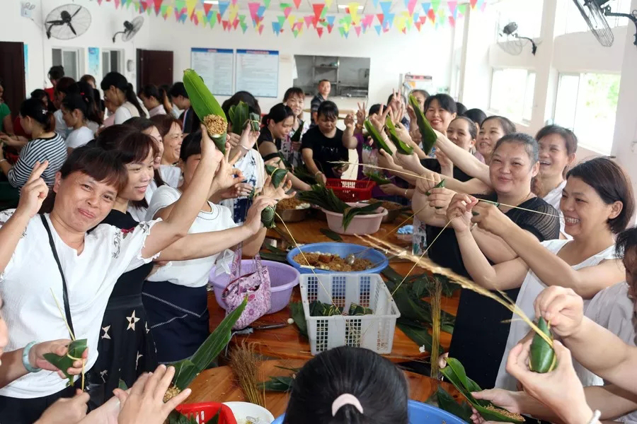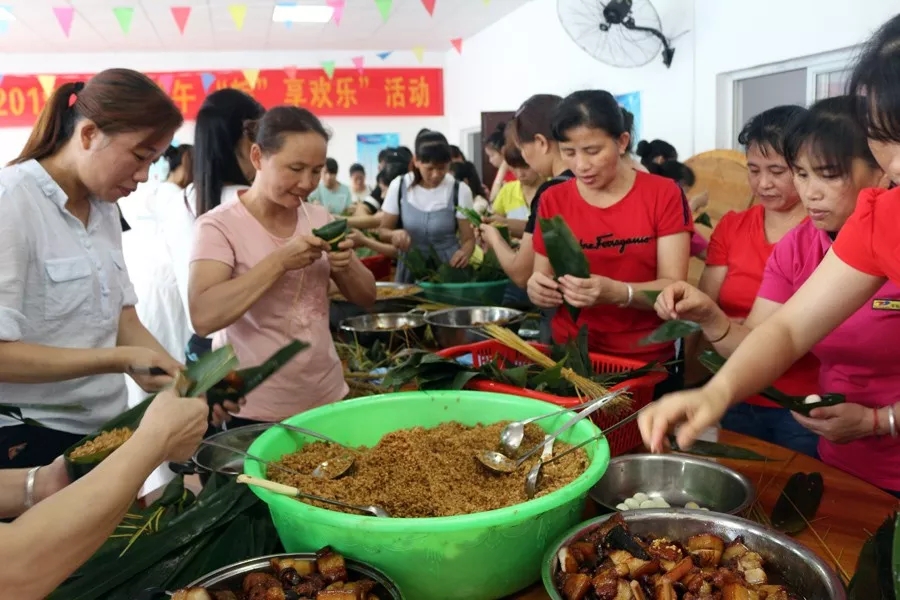 員工們歡聚一堂,包粽子,話家常,感受別樣的端午風(fēng)味。經(jīng)過大家的辛勤勞作,幾百個形態(tài)各異的粽子出爐了??諝庵猩l(fā)著清爽甘醇的氣息,香噴噴的粽子味道飄滿整個食堂,大家迫不及待品嘗起來。