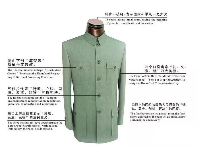 前襟的五粒紐扣和五個(gè)口袋(一個(gè)在內(nèi)側(cè))分別表示孫中山先生的五權(quán)憲法學(xué)說(行政權(quán)、立法權(quán)、司法權(quán)、考試權(quán),還有監(jiān)察權(quán)在領(lǐng)口(紐扣)和內(nèi)側(cè)(口袋),以彰顯監(jiān)察權(quán)的人民監(jiān)督作用);